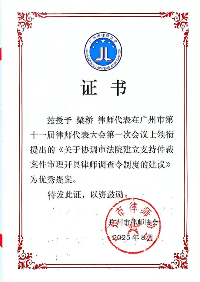策略广州执委会副主任、高级合伙人梁桥律师及其它20位律师共同提出的《关于协调市法院建立支持仲裁案件审理开具律师调查令制度的建议》以其专业深度与实践导向,成功获得广州市律协的认可并予以采纳,且被评为优秀建议。