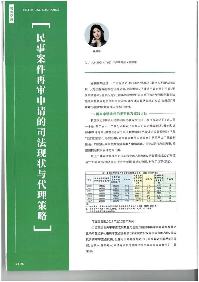 《广东律师》2025年第2期(总第245期)刊发北京策略(广州)律师事务所曹静珊律师撰写的文章——《民事案件再审申请的司法现状与代理策略》。